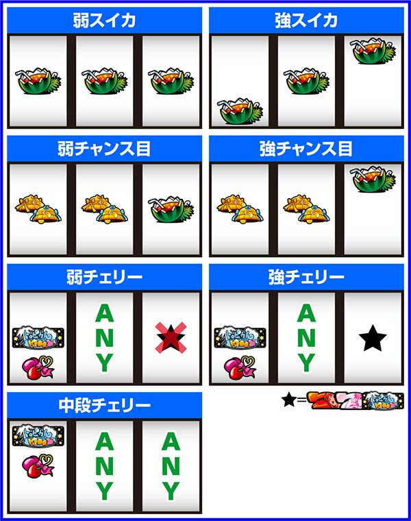 基本はハサミ打ちを推奨。スイカがテンパイした場合は中リールにもスイカを狙うようにしよう。