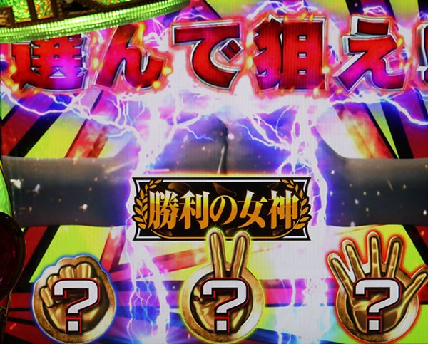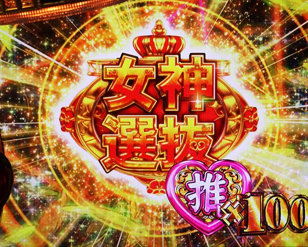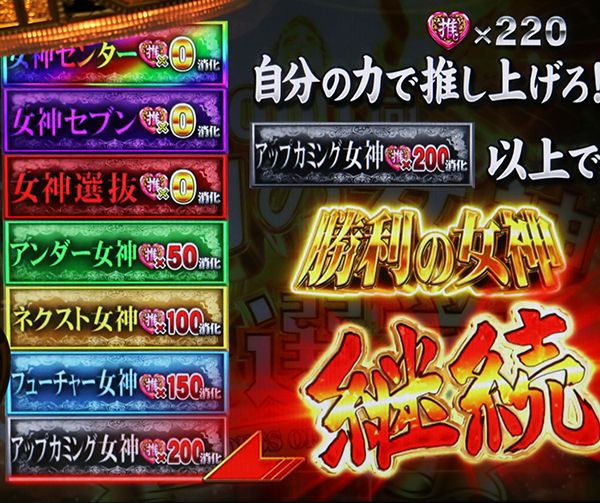 消化中はレア役成立で必ず1以上ランクがアップし、勝利の女神絵柄が揃えば女神選抜(継続)以上が確定する。