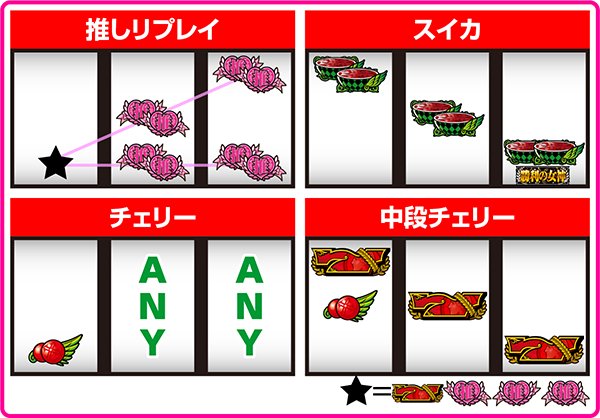 AKBURST中はレア役確率がアップし、倍推しモード中は上乗せした推しポイントを2倍、4倍、8倍のいずれかにアップさせる。