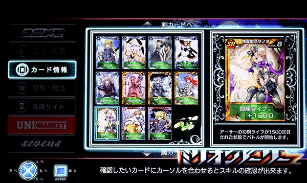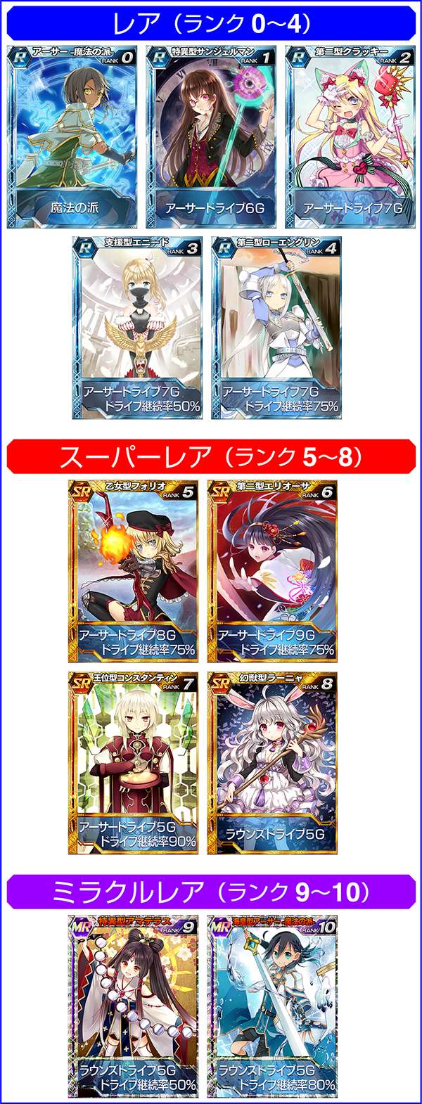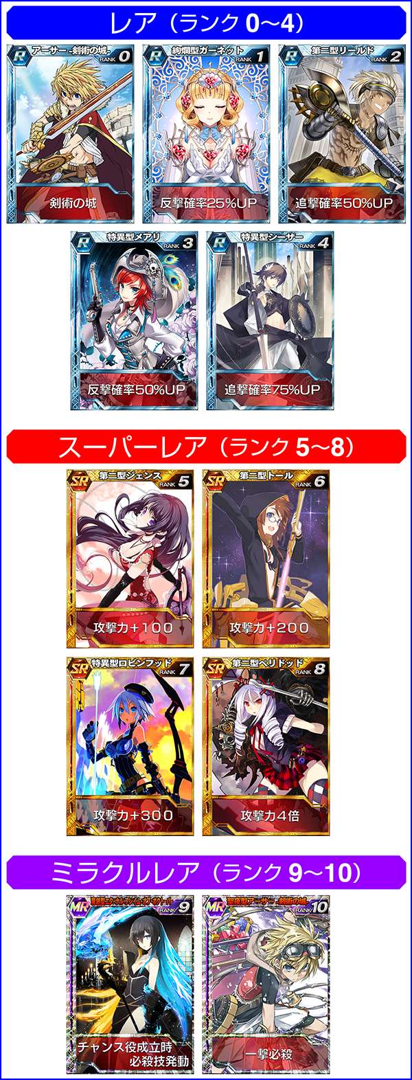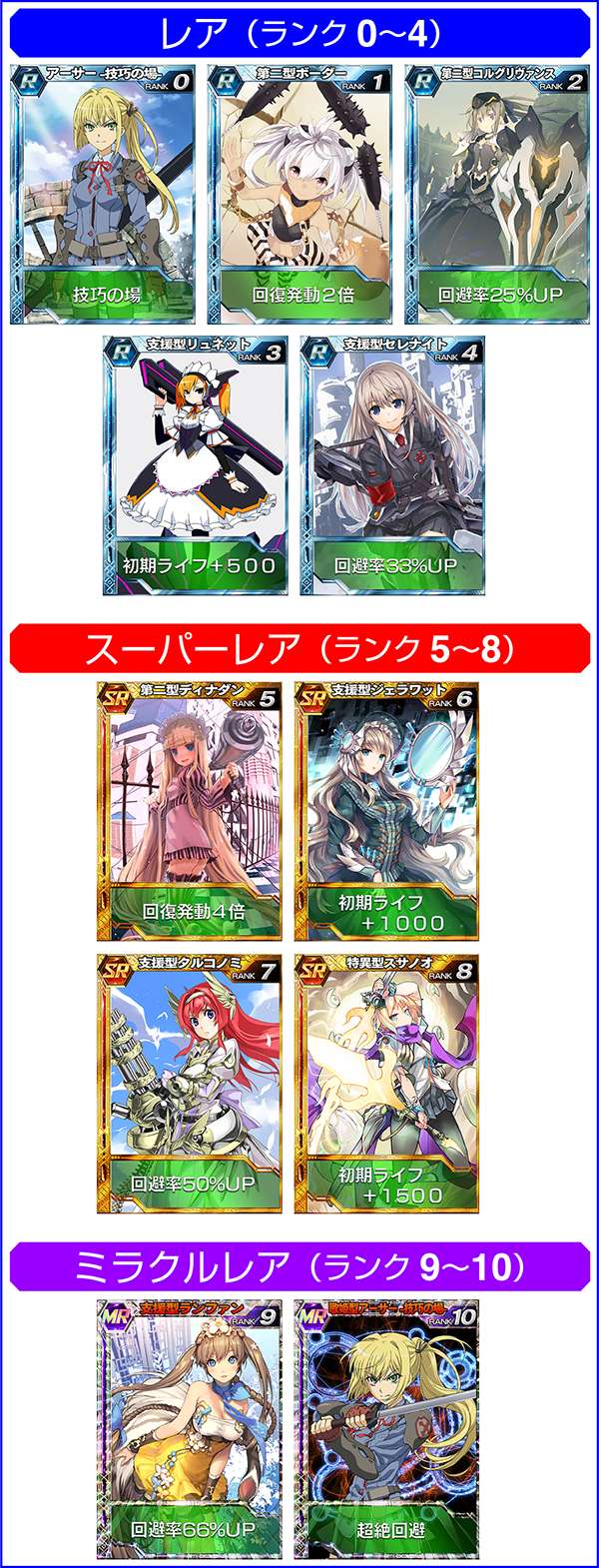 初期カード(特に恩恵なし)を含め、攻撃系・支援系・報酬系のカードはそれぞれ11段階のランク(カード右上に表示)に分かれている。
