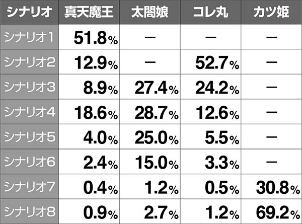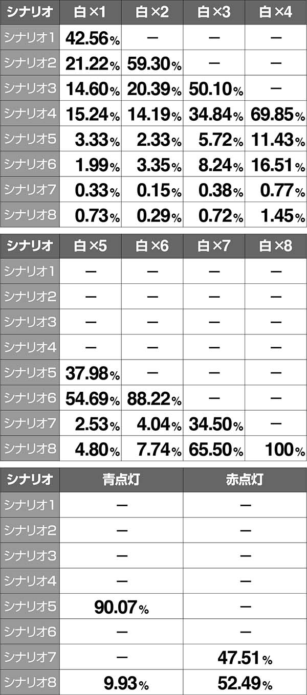 ボーナスの当選タイミングが有利区間中か否か、当選契機がレア役かリプレイかで修羅モード突入率が変化する。青同色に関しては当選契機不問で修羅モード確定となり、有利区間中なら50%でARTに当選。異色は当選契機が重要で、レア役なら修羅モード突入の大チャンスとなる。