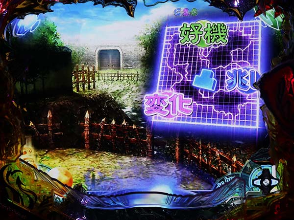 変動開始時に突如突入する先読みゾーン。背景が妖魔の接近を予感させる紫に変化。