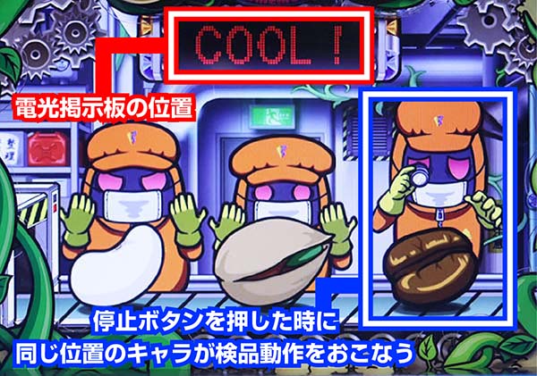 左リールに『ベル・赤7・ベル』をビタ押しすると発生するボイスと、消化中に増えていく豆キャラの最終的な数で設定を示唆。