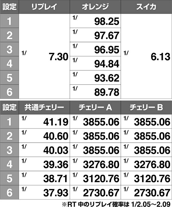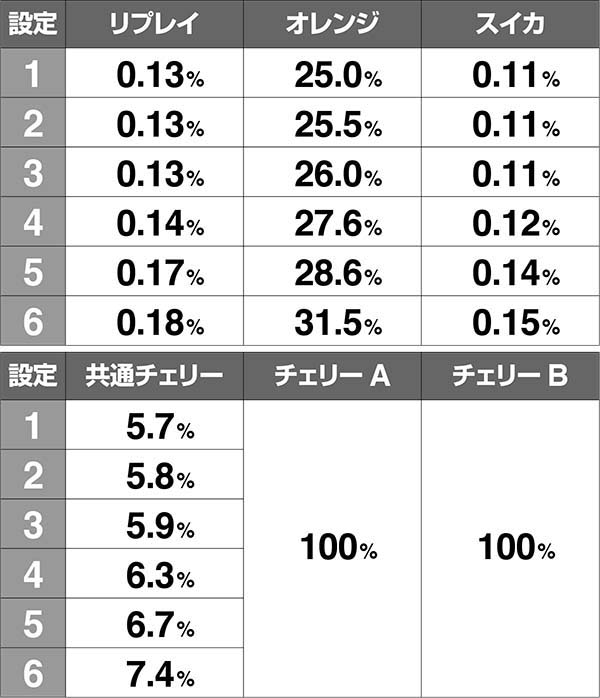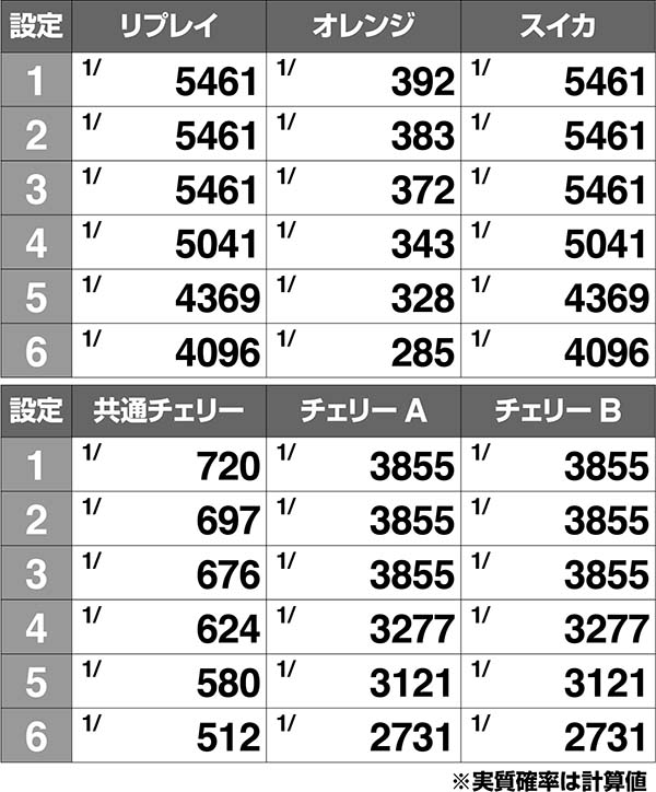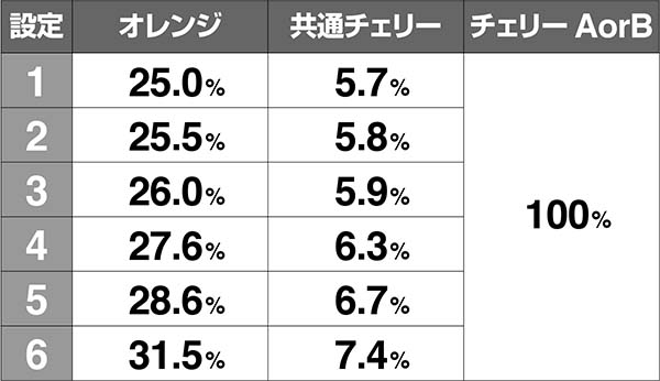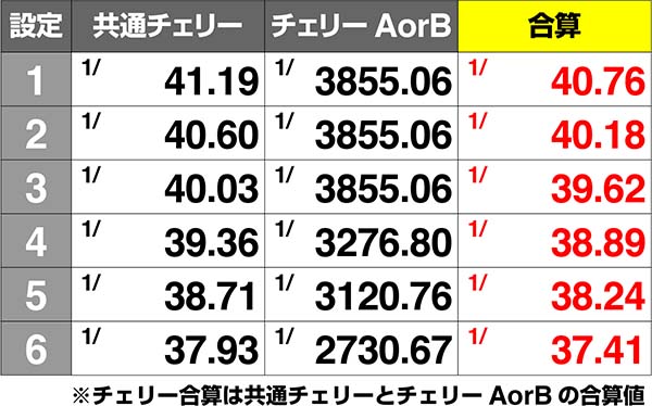 チェリーには共通・A・Bという3パターンがあり、前者はどちらのチェリー(3番と14番)でも停止するが、後者はどちらか一方しか停止しない。ただし、チェリーAとBの確率は一緒なので共通チェリーとチェリーAorBの片方を合算した確率でチェックするのがベストだ。