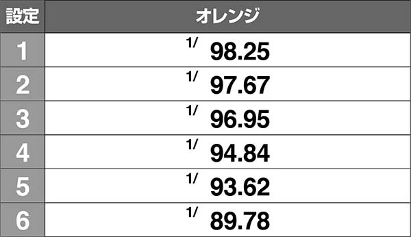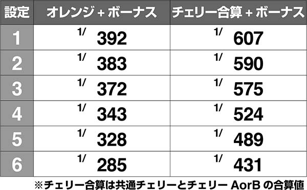 オレンジ・チェリーは確率、ボーナス同時当選期待度ともに高設定ほど優遇。設定差はそれなりにあるため、サンプル数を増やせば高い精度で設定を推測することができる。