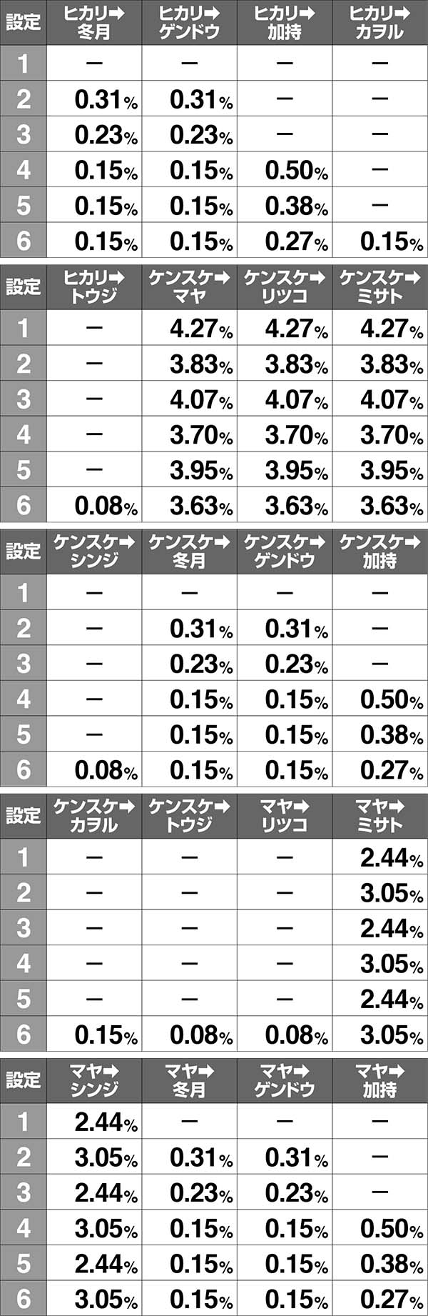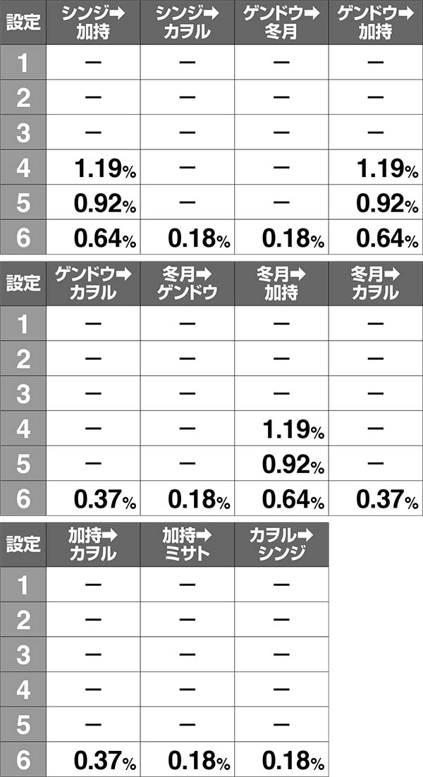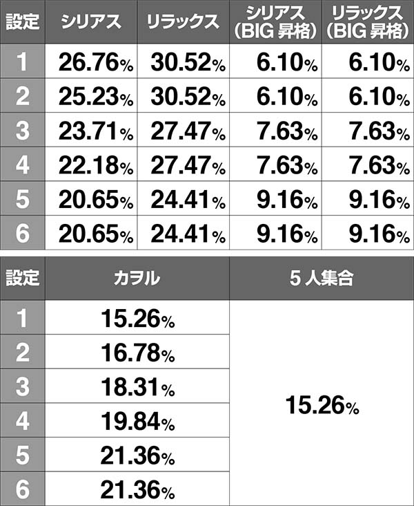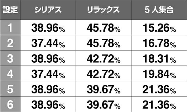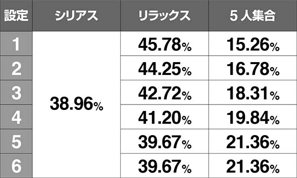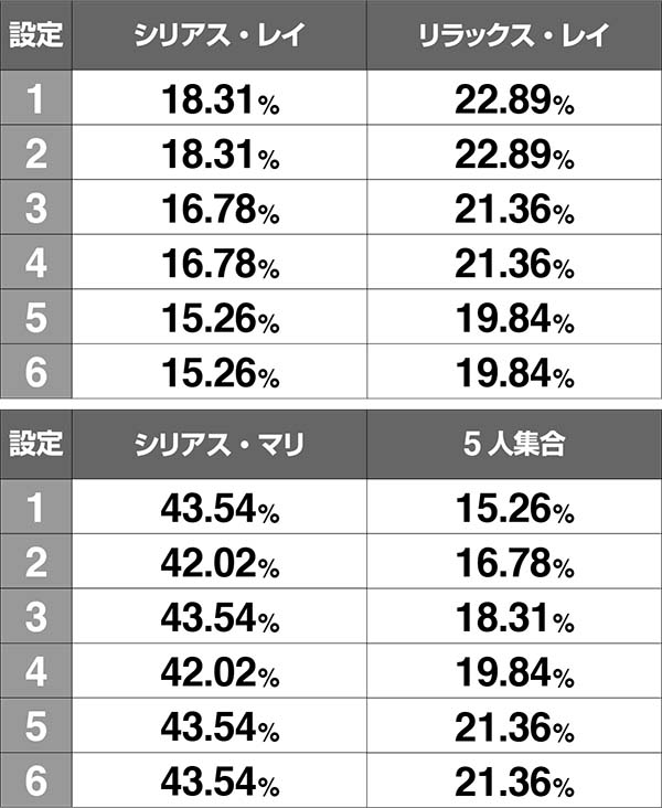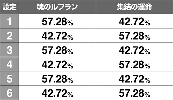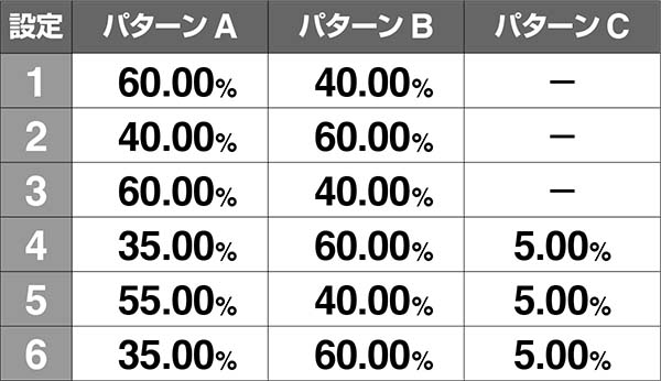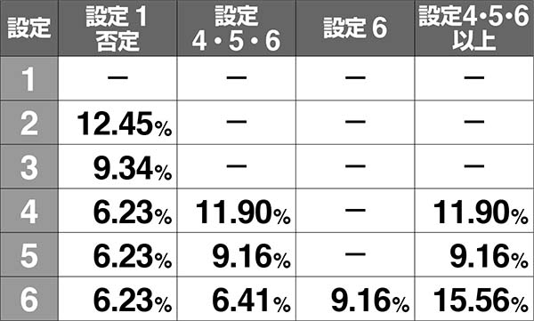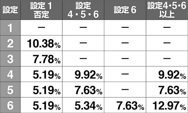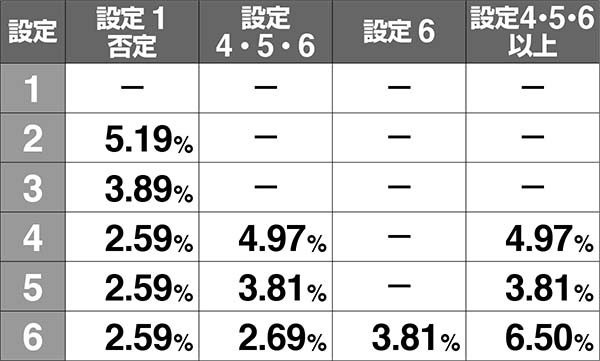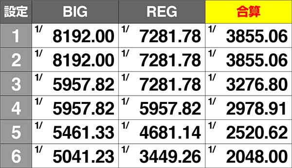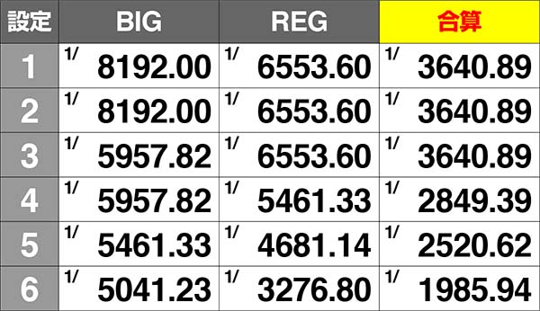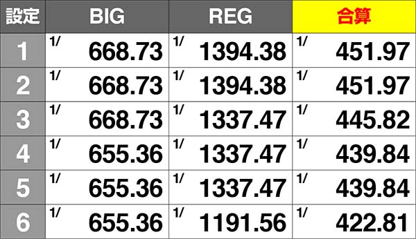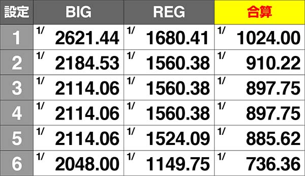 設定差は大きいが分母が大きいため、設定推測に役立つケースが少ない。複数回確認できれば高設定期待度がアップする。