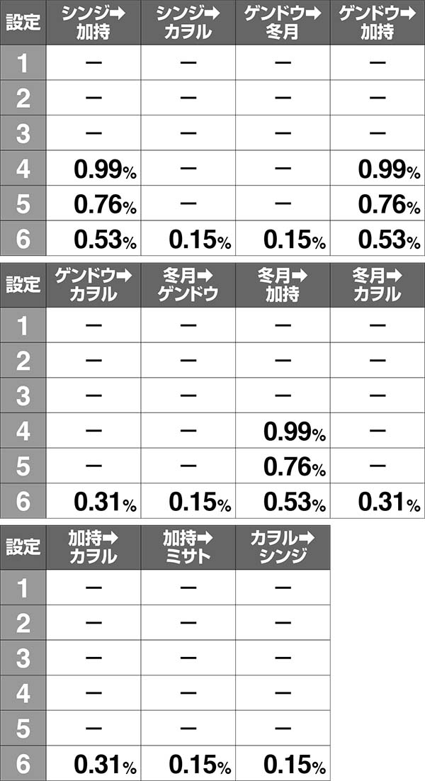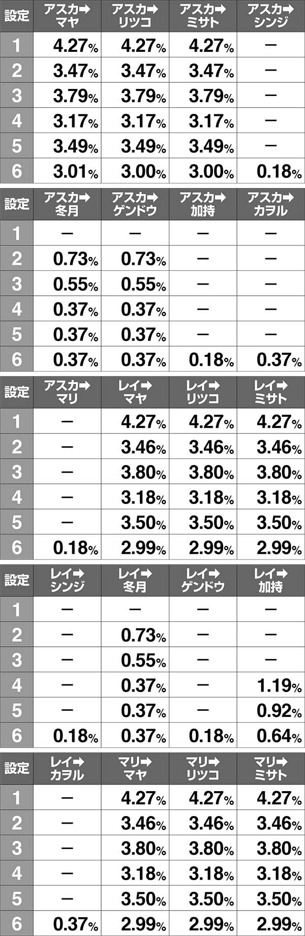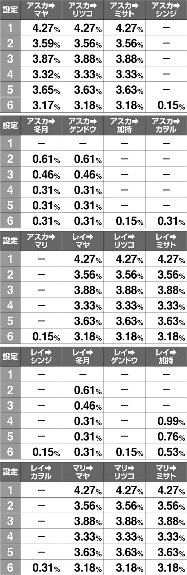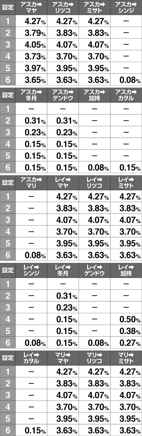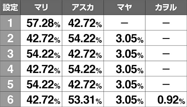キャラ紹介の出現割合はREGに当選したタイミングに応じて異なり、設定変更後1回目orREG3連続目が若干優遇されている。