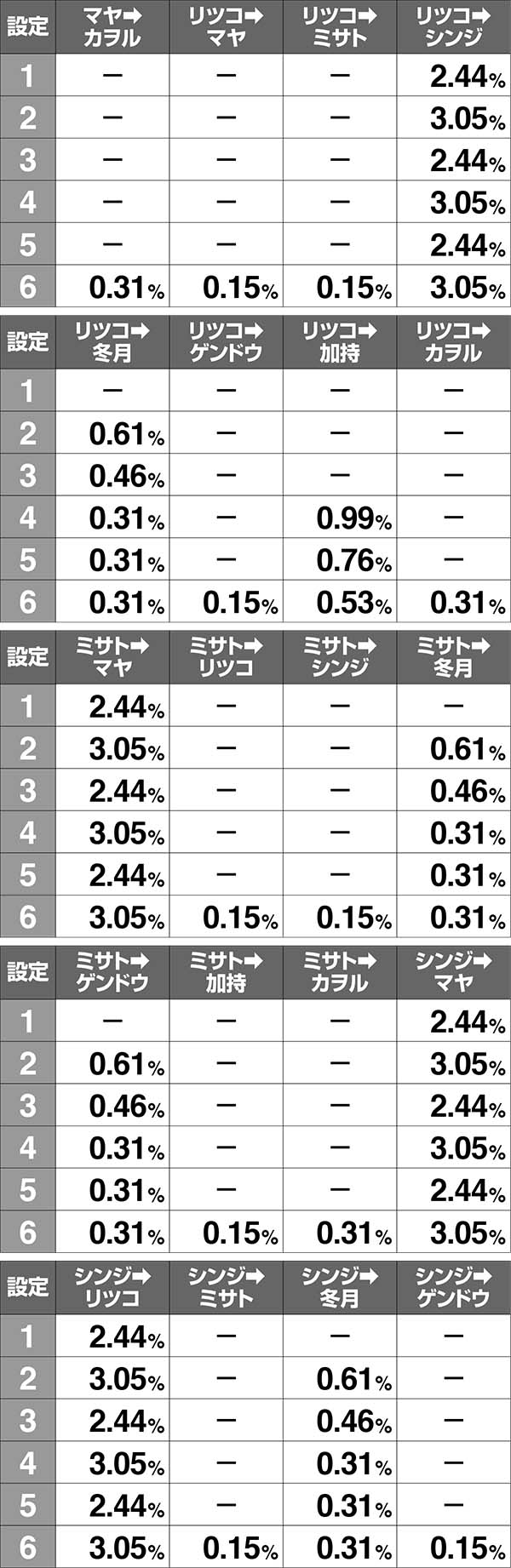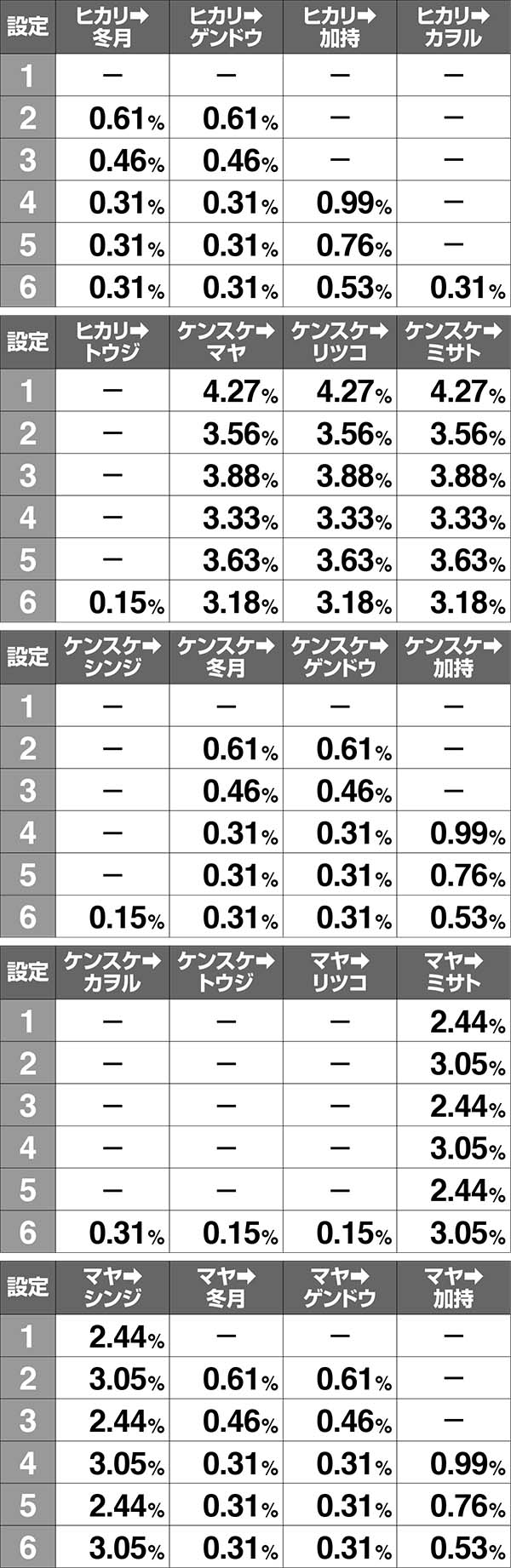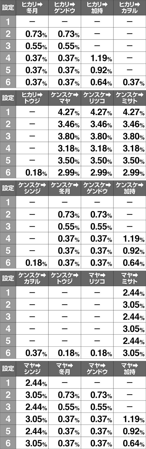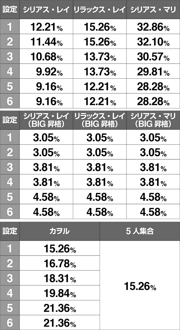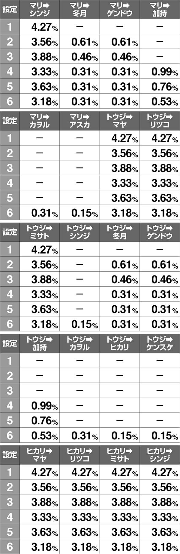 キャラ紹介の出現割合はREGに当選したタイミングに応じて異なり、設定変更後1回目orREG3連続目が若干優遇されている。
