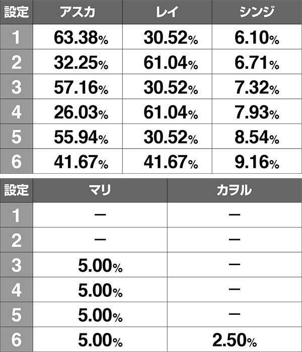 BIGの種類と終了画面のキャラはリンクしており、赤7BIGはアスカ、青7BIGはシンジ、黄7BIGはレイとなる。どのBIG終了画面も通常とSPの振り分けは同一だ。