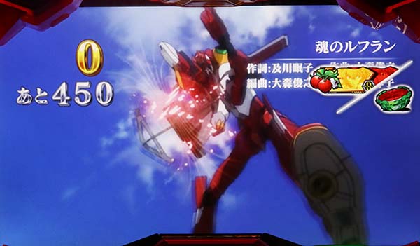 第3停止後に上下導光板赤点滅(液晶は初号機の目)+筐体震動2秒、ボーナスランプ白