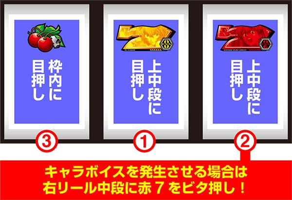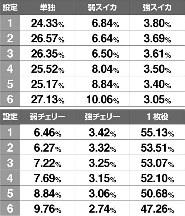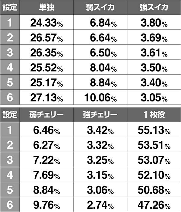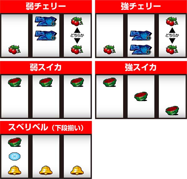 弱チェリーと弱スイカといった弱レア役は、高設定ほど同時当選期待度が高い。強レア役となる強チェリーと強スイカ、1枚役はボーナス確定。順押し小役狙い時は1枚役と単独の判別は困難。