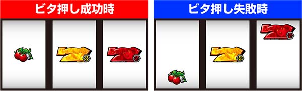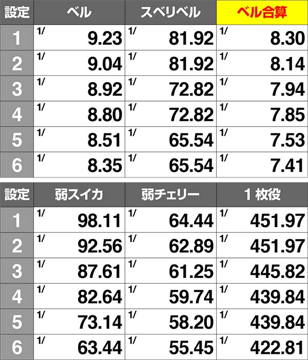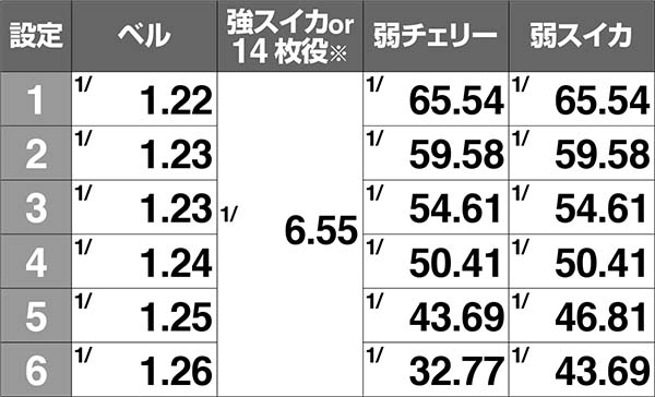 弱チェリーと弱スイカの同時当選期待度は、若干ではあるが高設定ほど高い。強チェリーと強スイカ、1枚役はボーナス確定。順押し時は1枚役と単独の判別は困難。