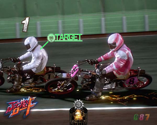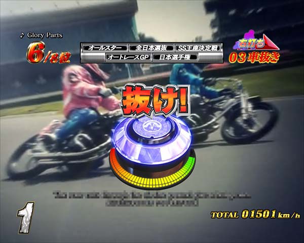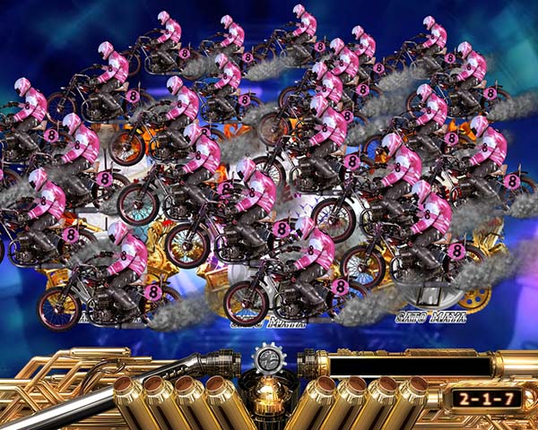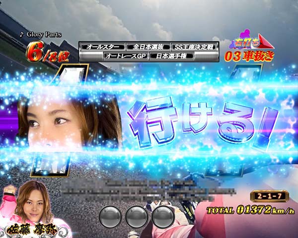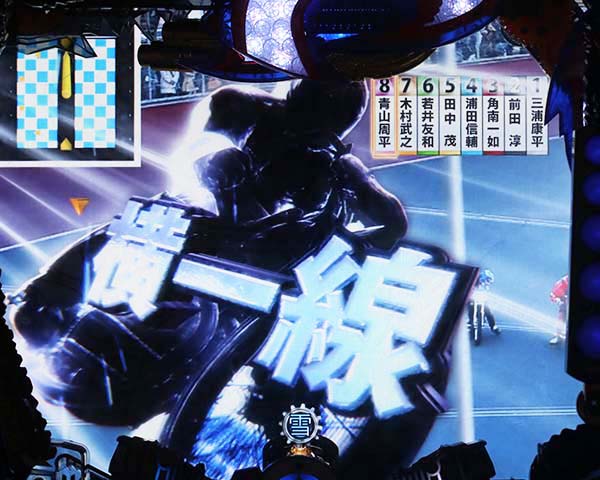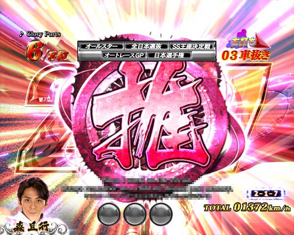 大当り確率約1/184、確変は9回リミットタイプ。 リミット到達後は必ず時短に突入。時短中に確変大当りに当選すればリミットが再セットされる。 大当りするたびに順位が上がっていくレースさながらの緊張感と聖地「川口オートレース場」を細部まで表現した映像は必見。森 且行を含めた総勢36名のレーサーがみせる迫力満点のバトルから目が離せない! |