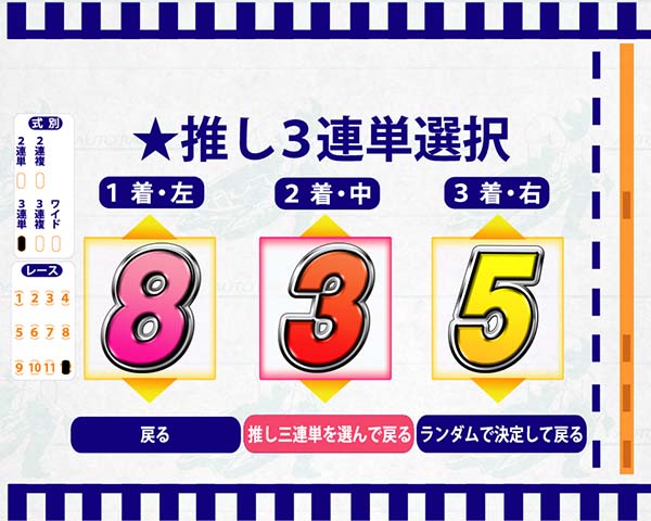 待機画面中にボタンを押すと推し3連単を選択できる。