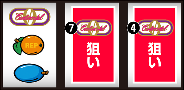成功したら中リール上段付近に7番のブランク、右リール上段付近に4番のブランクを目押し。