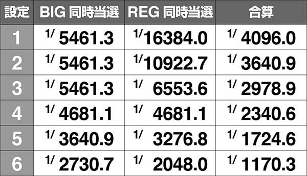 REGとの同時当選確率は設定差が大きいため、複数回確認できれば高設定に期待できる。