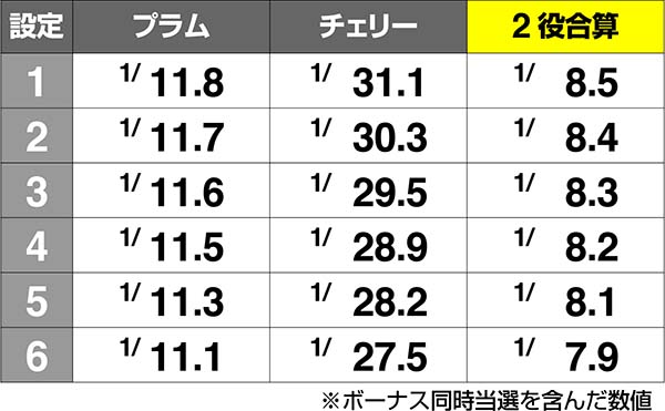 プラムとボーナスの同時当選確率は高設定ほど優遇。同時当選時は必ず払い出し音が遅れるという特徴もある。