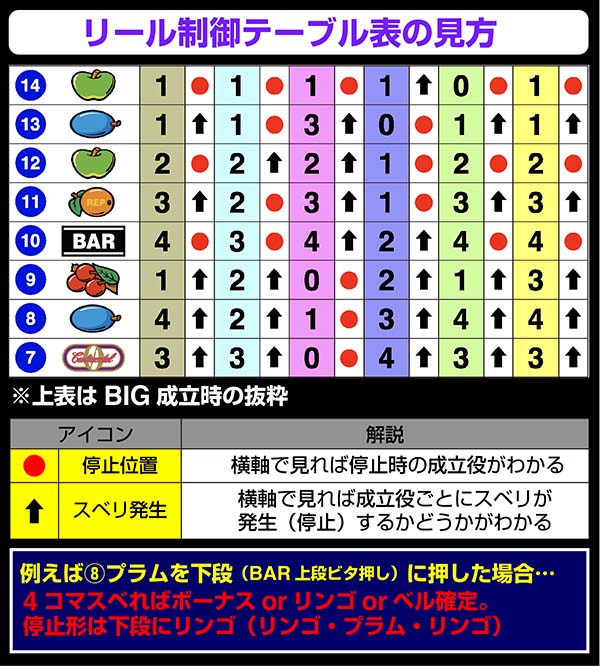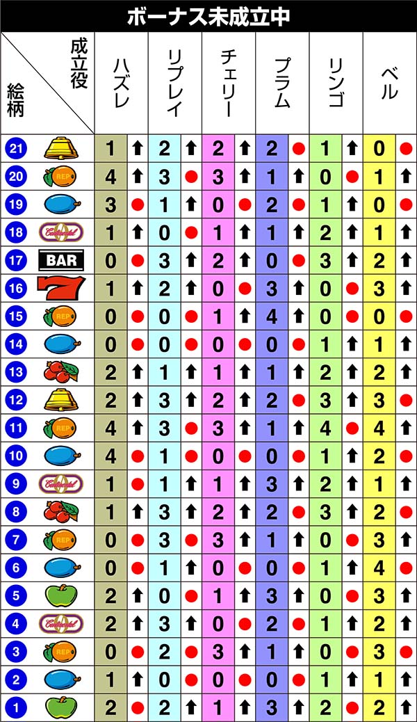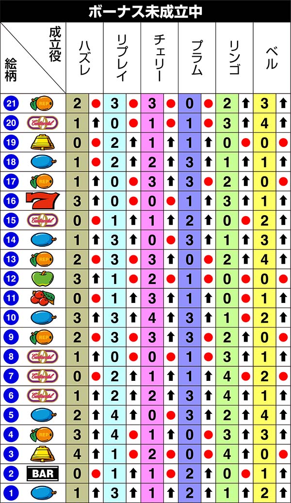 右リール下段に15番のリプレイがビタ止まりした時の対応役はチェリー・プラム以外の全役。中・左リールでリンゴとベルを同時にフォローすることができない。