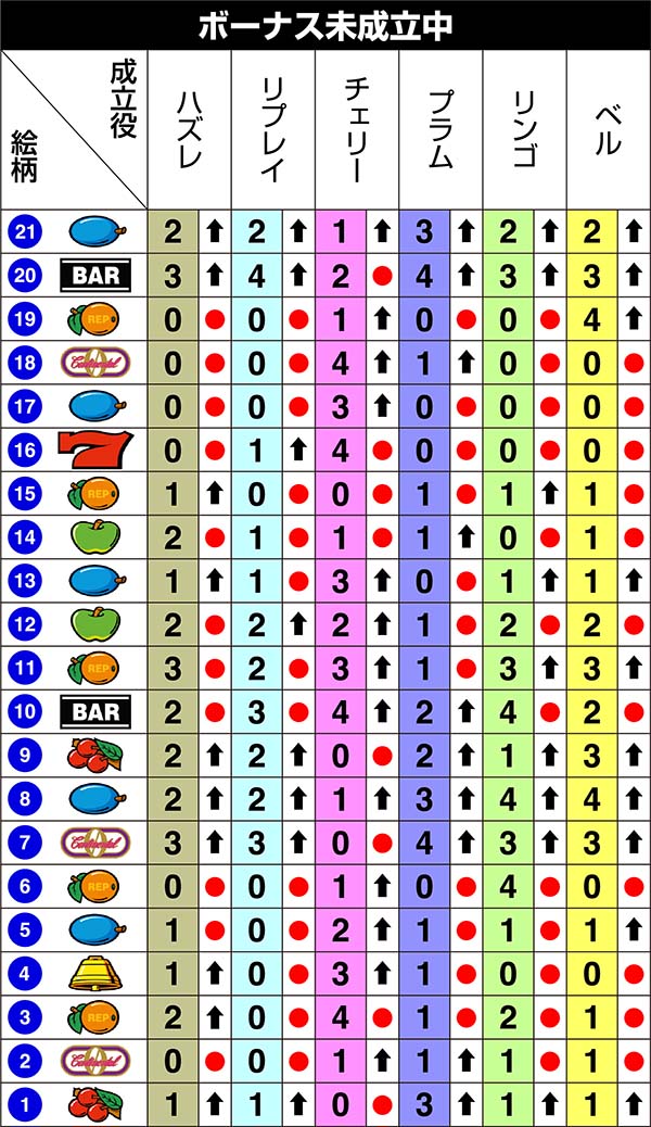 ボーナス全体の約3割がプラム、チェリーとの同時当選(リンゴとベルは同時当選なし)。約7割が単独当選となる。