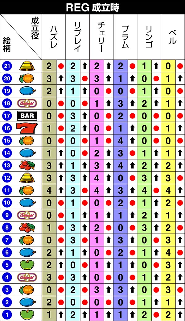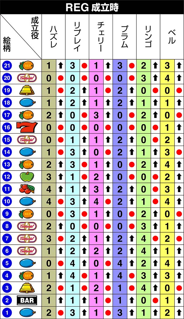 REG中のビタ押し手順による設定示唆内容はランプが光った時点で設定2以上確定。当該のREG当選時における総ゲーム数によって手順成功時のランプ点灯率と示唆内容が変化する。