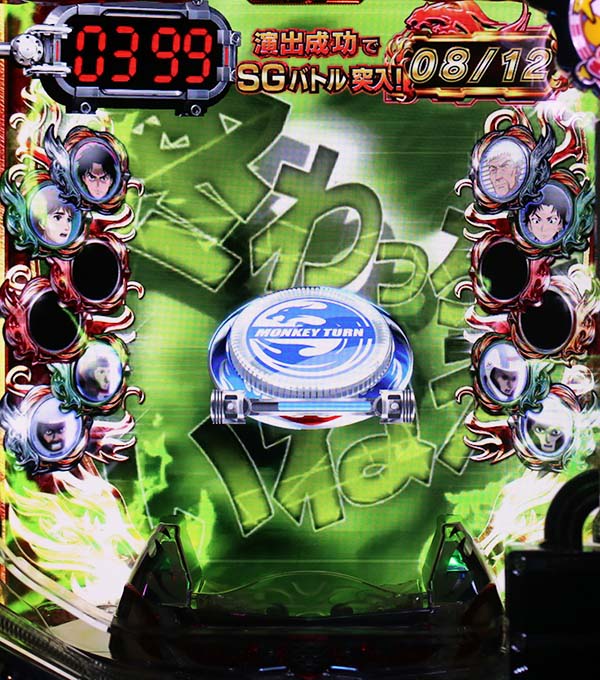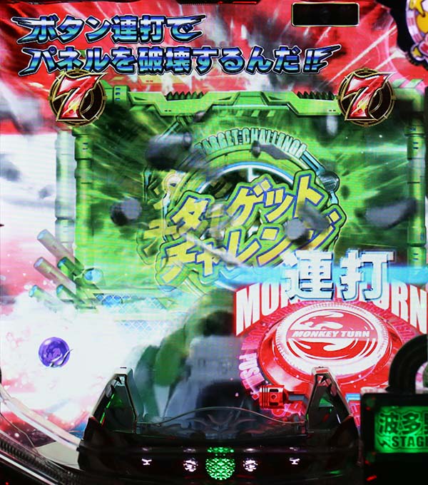 「CRモンキーターン」シリーズの第4弾は連チャンの壁を超えるSG(スペシャルグレード)スペック!! 大当り確率約1/66、確変リミットは10回。SGバトル(電サポ4回転)中に大当りすることで連チャンの道が切り開く。 電チュー経由の大当りは次回大当りまで電サポが付くため、リミット到達まで連チャン継続。リミット到達後の時短50回転で引き戻せばリミットが再セットし、怒涛の大連チャンが幕を開ける! |