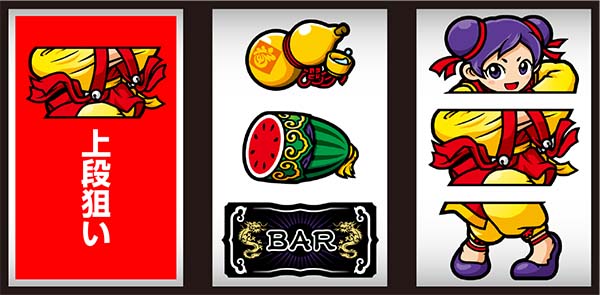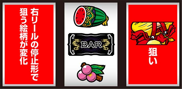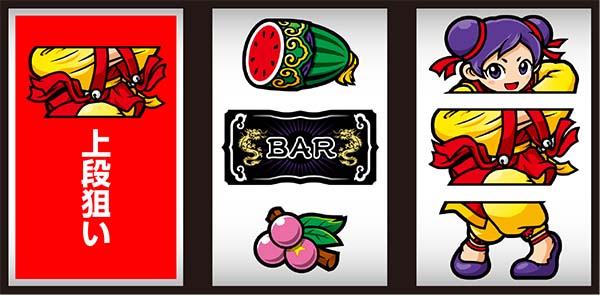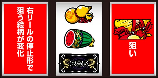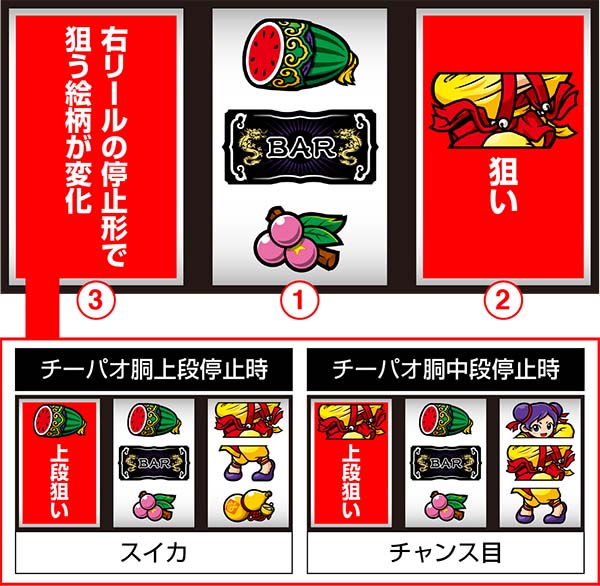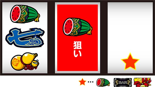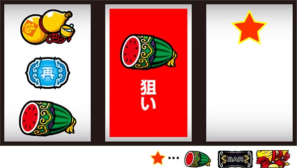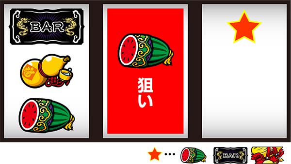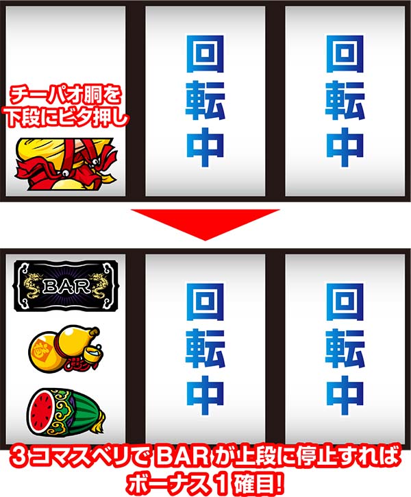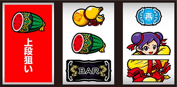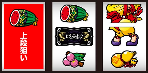 右リール上段にスイカorチーパオ(胴)orBAR停止時は中リールにスイカを目押しすればOK。