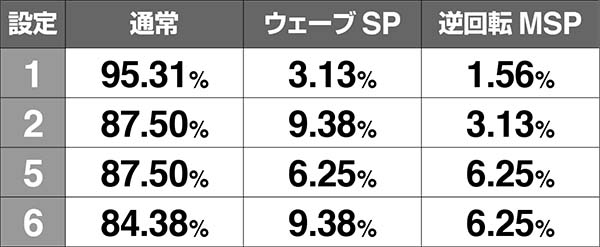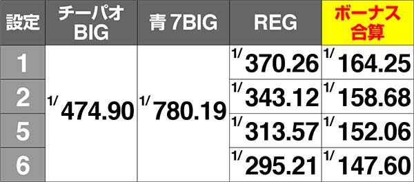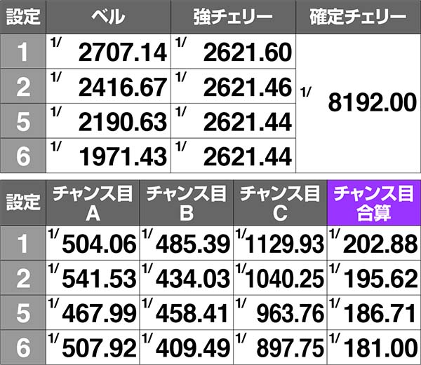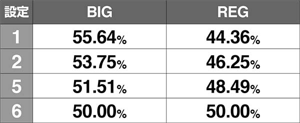 BIG確率はいずれも全設定共通。REG確率は高設定ほど優遇されている。
