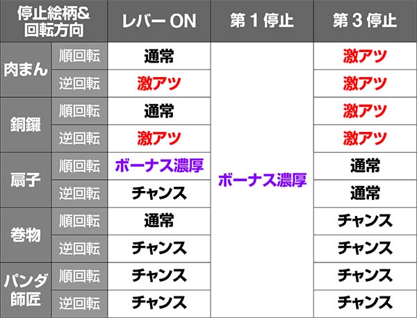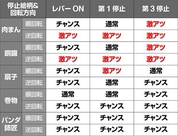 チーパオBIGを特殊揃いさせた場合は、リールアクションで通常揃い(3連チーパオ)をさせてから開始。リールアクションのパターンに応じて設定示唆をおこなっており、ウェーブは偶数設定が優遇、逆回転なら高設定の期待が高まる。