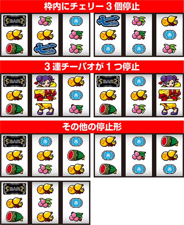 チーパオランプ点滅とともに予告音が発生した時は、すべてのリールにチーパオ絵柄を目押し。停止パターンによって設定を示唆。