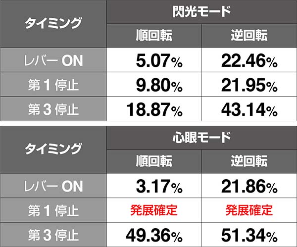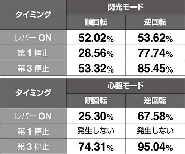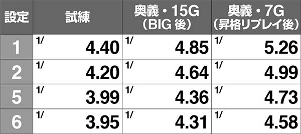いずれのRT中も高設定ほどハズレが出やすいため、しっかりチェック。奥義は15Gと7Gでもハズレ確率が異なるところもポイントだ。