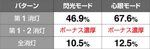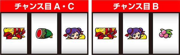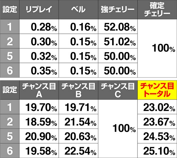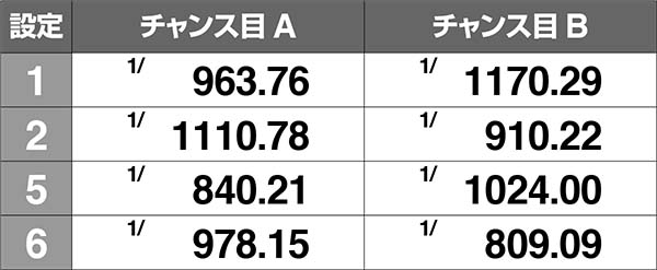 チャンス目AorBとREGの同時当選確率には設定差が存在。チャンス目Aは奇数設定示唆、チャンス目Bなら偶数設定示唆となる。