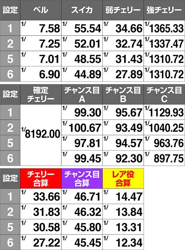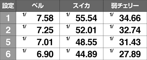 小役確率による設定推測をおこなう場合は、ベルとスイカ、弱チェリーの3役のカウントをオススメ。いずれの役も高設定ほど優遇されている。