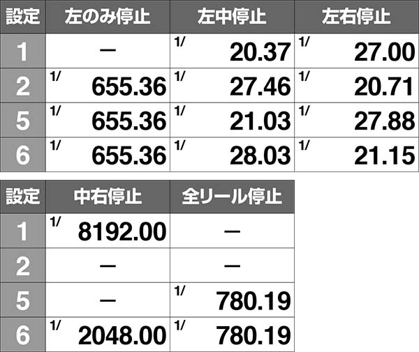中右停止は設定6の方が4倍出やすい、全リール停止は設定5以上確定だ。