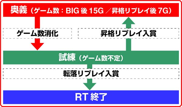 RTは『奥義』と『試練』の2パートで構成されており、BIG終了後は必ず奥義からスタート。奥義のゲーム数消化後に移行する試練で昇格リプレイを入賞させれば、再び奥義に昇格する。