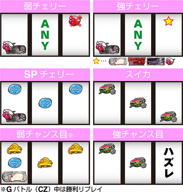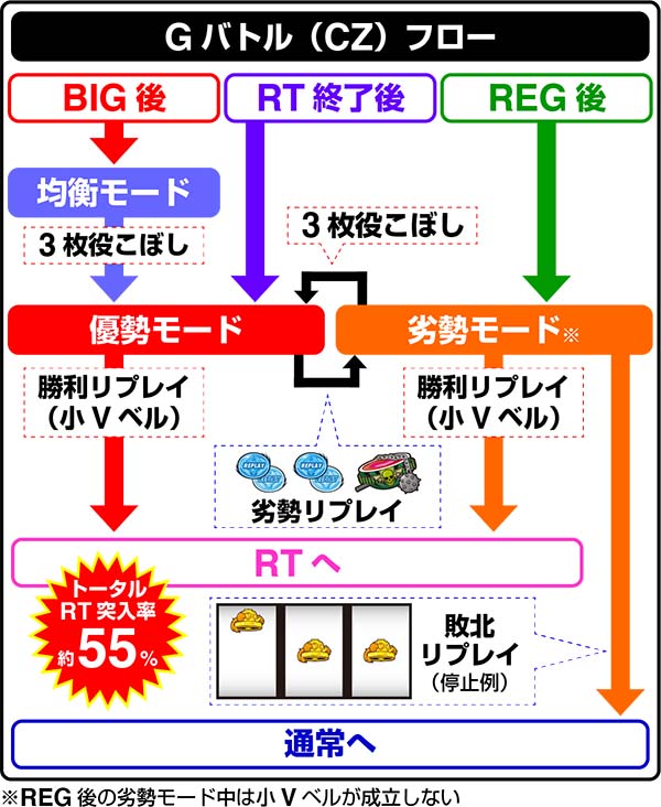 BIG後のCZはRT突入リプレイが高確率で成立しやすい優勢モードが確定。REG後は優勢モードへの昇格(3枚役のこぼし)に期待しよう。