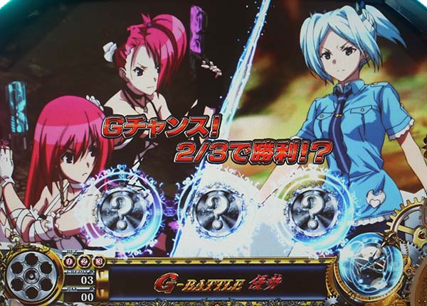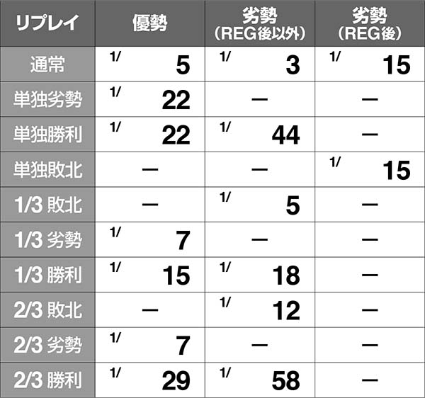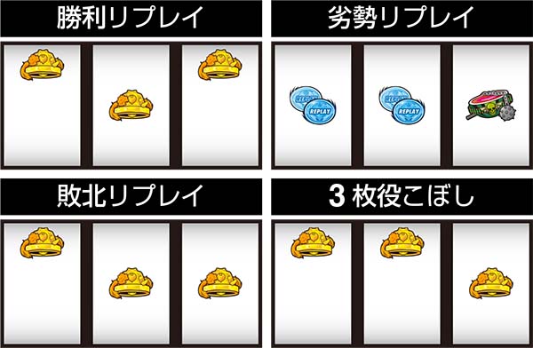 白だと敵の攻撃となり敗北リプレイのピンチ。赤なら味方の攻撃となり敗北リプレイを否定。いずれも、押し順当てに成功すれば敗北回避やRT突入となる。