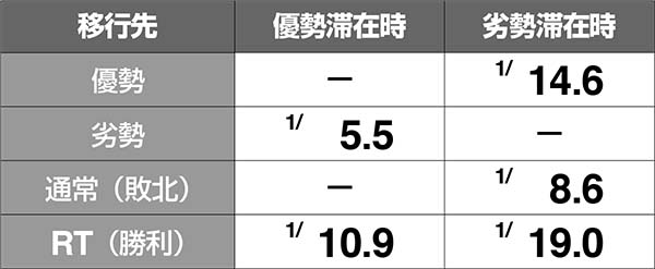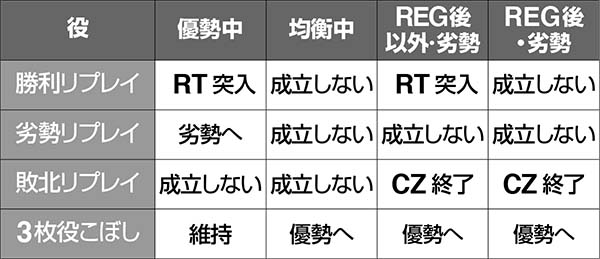 モードは優勢と均衡、劣勢の3種類(RT状態)があり、RT突入期待度が変化する。各モードは小役を契機に行き来し、優勢モードなら勝利リプレイが高確率で成立。逆に、劣勢モードだと敗北リプレイ成立のピンチとなる。