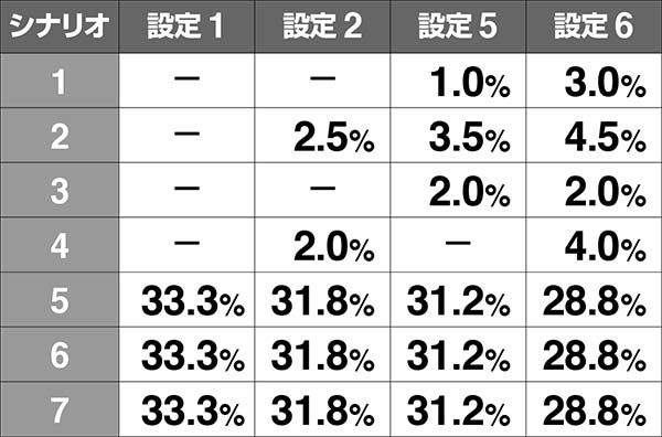 シナリオ5〜7が通常パターン。シナリオ1〜4が選ばれれば設定2以上が確定する。