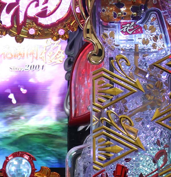 | 機種概要 | 250回転の超ロングV確ST機となった「CR金の花満開」。ヘソ経由での大当り時は確変突入率33%だが、通常でも必ず時短100回が付く。電チュー経由の大当りはオール16Rと一撃性を秘めている部分も魅力のひとつだ。確変or通常のどちらか分からない電サポ中のドキドキ感や歴代シリーズの花満開リーチを搭載した豪華絢爛な演出など、あらゆる面から目が離せない1台となっている。 |