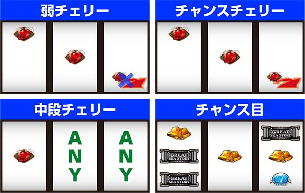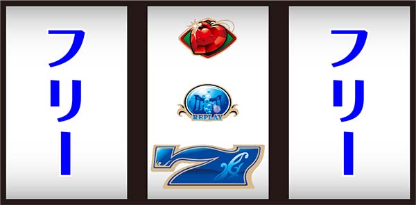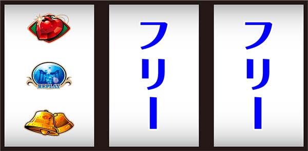 小役狙いなら右下がりにBAR・リプレイ・ベル、フリー打ちなら右上がりリプレイ・リプレイ・チェリーが停止。REG後の1G目も同様に昇格リプレイが成立すれば突入する。