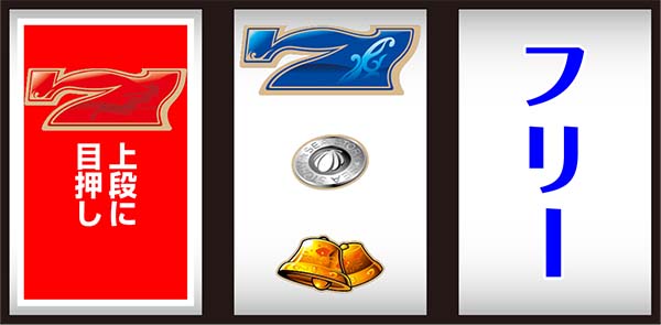 チャンス目orボーナスが確定。右リールをフリー打ちし、左リール上段に赤7を目押しすればチャンス目(6枚獲得)をフォローできる。