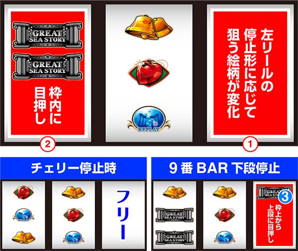 9番のBARを枠上から上段の2コマ内に目押しし、9番のBARが下段に停止した場合のみ目押しをおこなう。それ以外の停止形はフリー打ちでOKだ。
