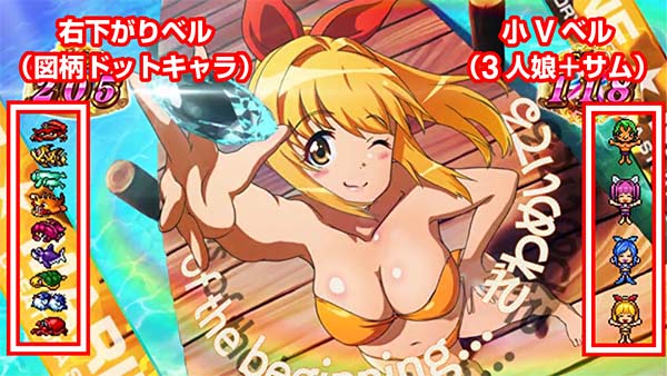 右下がりベルならドットの図柄キャラ、小Vベルなら3人娘が出現。初回の小Vベルでのみ登場する可能性がある3人娘出現+サムは設定5以上が確定する。