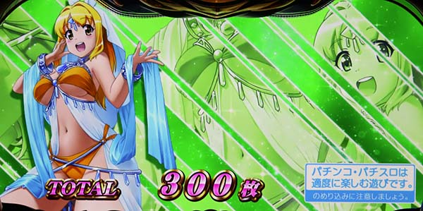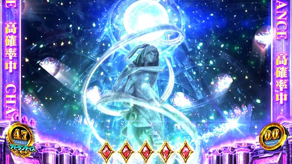 チャンス目orチェリー対応の演出。女神の衣装(ティアラを着けているパターン)ならボーナスの大チャンス、サムが登場すればBIGが確定する。