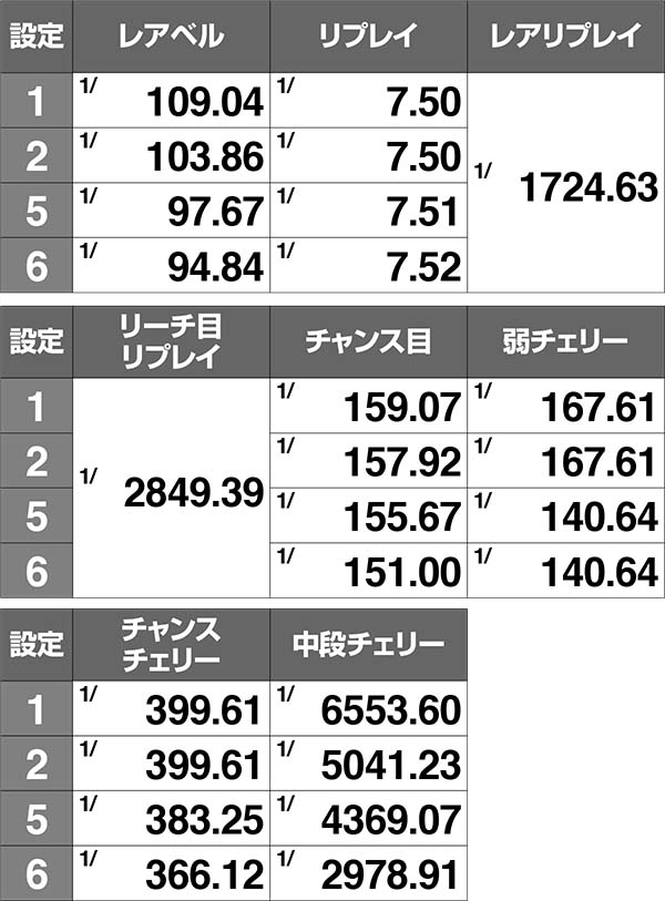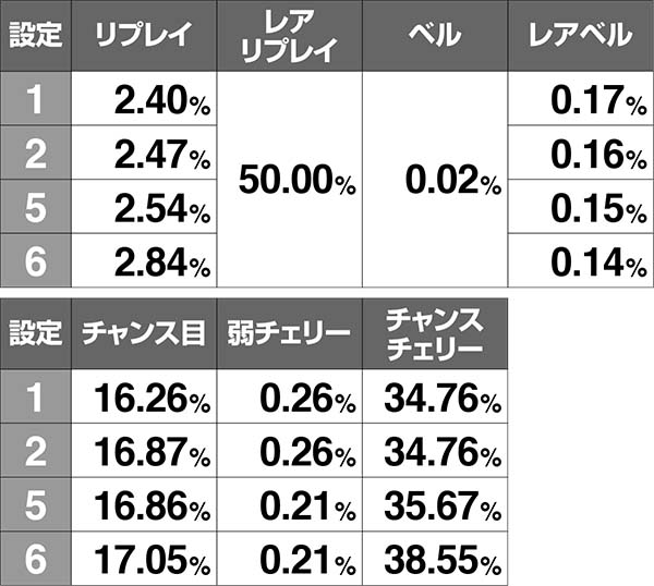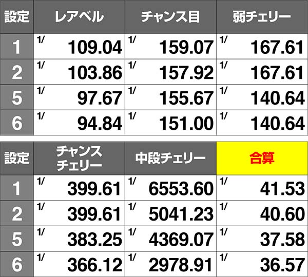 レア役確率による設定推測は、上記の特定役をカウント。チェリーは3種類(弱、チャンス、中段)あるが、すべてカウントしよう。合算確率で40分の1を上回れば高設定に期待できる。