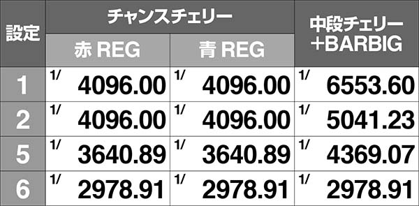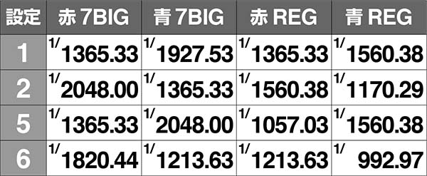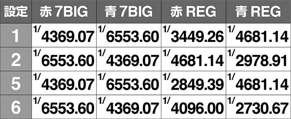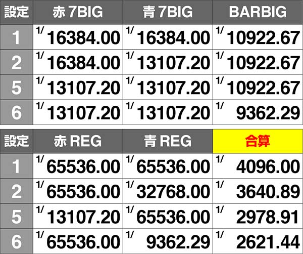 合算確率は高設定ほど優遇。赤REGなら設定5、青REGなら偶数設定示唆となる。