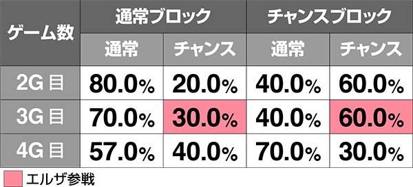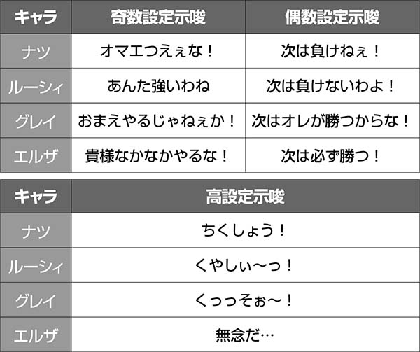 エルザはBAR揃いリプレイ成立時の約43%でBARが揃う(ボスを撃破)。それ以外の仲間は成立役に応じてボスの撃破抽選をおこなう。