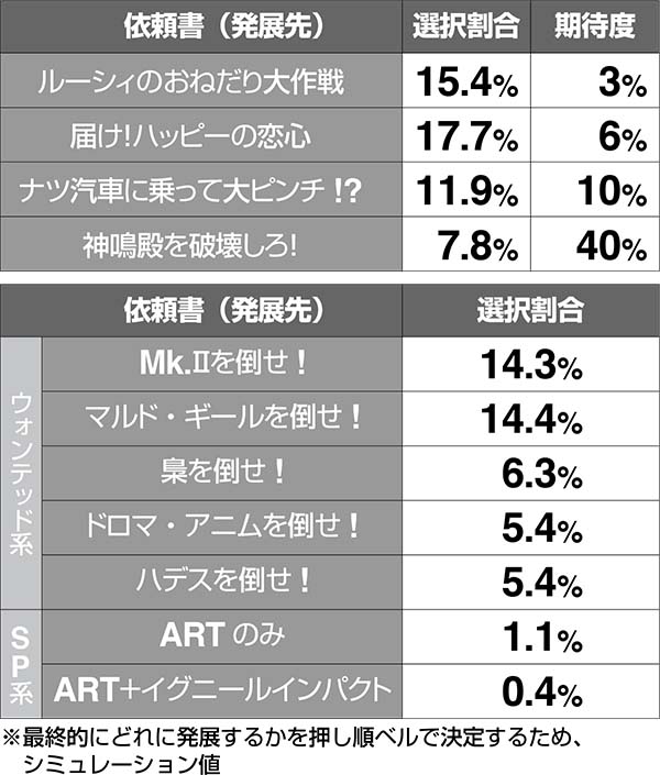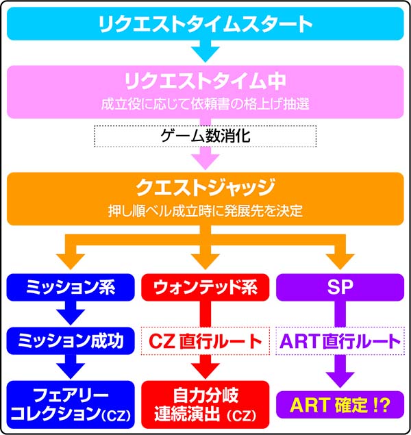 通常時には通常、高確、超高確が存在し、小役またはボーナスで状態移行やCZのチャンスとなるリクエストタイムを抽選。小役でリクエストタイムに当選した時は前兆を経由して突入、ボーナス経由時は消化中に依頼書が集まり終了後にクエストジャッジに移行する。