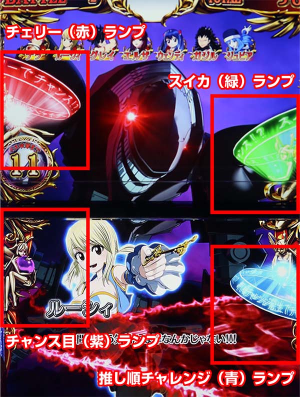 暗転後に発生したキャラ予告のキャラに応じて設定を示唆。ジュビアやウェンディなら高設定の可能性がアップする。