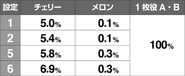 そこまで大きな差ではないが、メロン確率は高設定ほど高く、サンプルも集めやすいため、設定推測のサブ要素としてチェックしておこう。